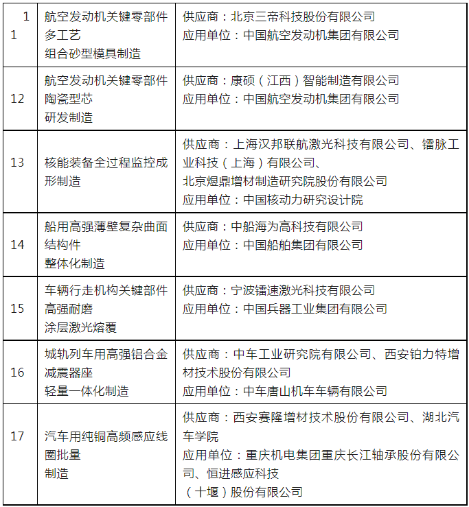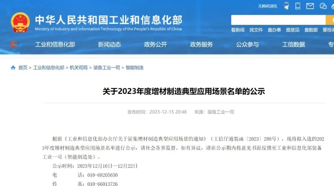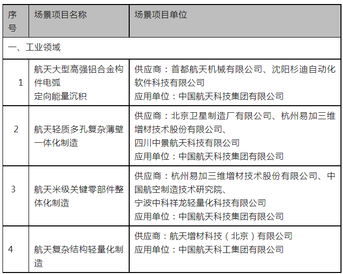 2023年12月15日,工信部发布了《关于2023年度增材制造典型应用场景名单的公示》 ,共有工业领域“航天大型高强铝合金构件电弧定向能量沉积”等42项入选。详细内容如下: